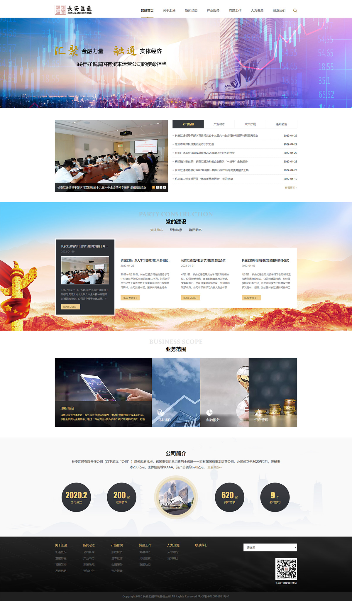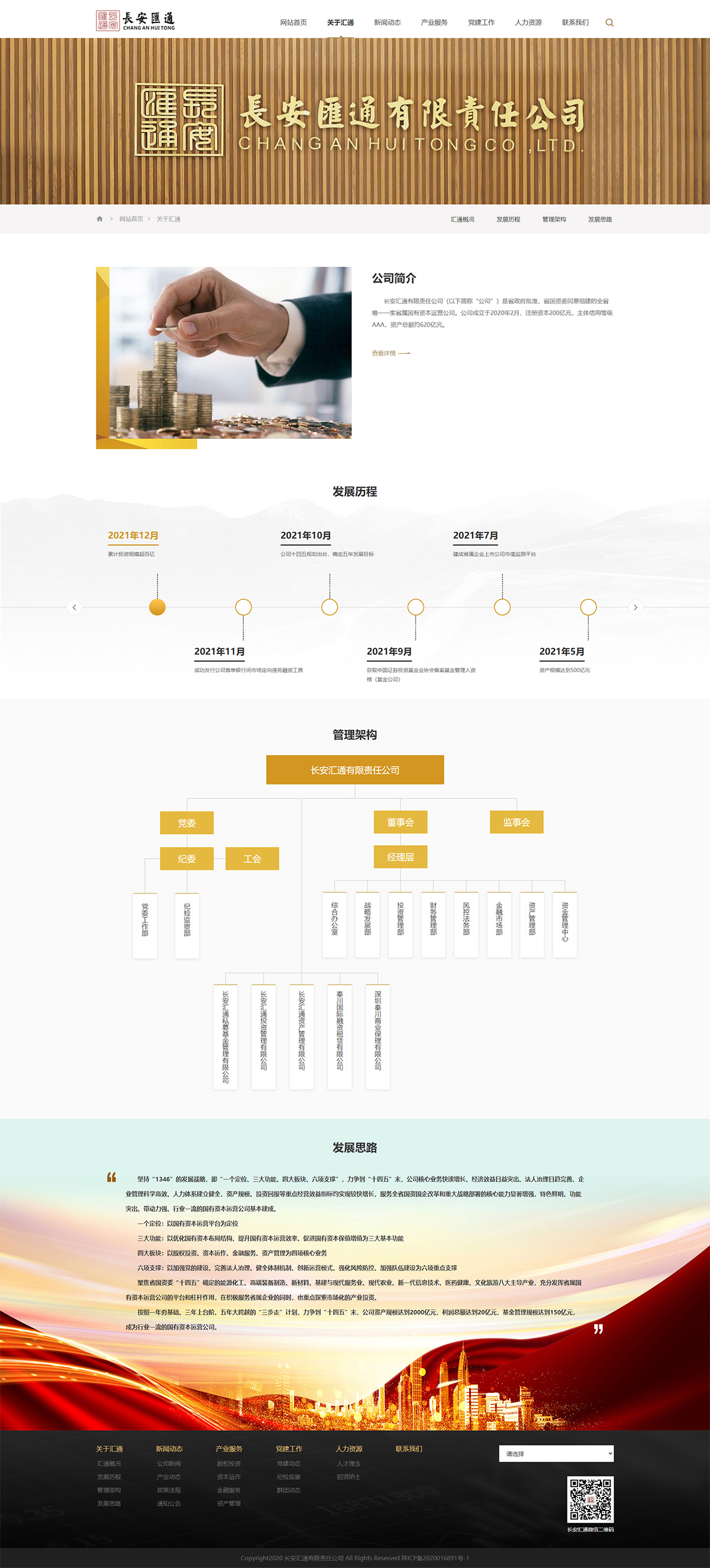 長(cháng)安匯通有限責任公司(以下簡(jiǎn)稱(chēng)“公司”)是省政府批準,省國資委同意組建的全省唯一一家省屬?lài)匈Y本運營(yíng)公司。公司成立于2020年2月,注冊資本200億元,主體信用等級AAA,資產(chǎn)總額約620億元。公司設有綜合辦公室、黨委工作部(紀檢監察部)、戰略發(fā)展部、投資管理部、財務(wù)管理部、風(fēng)控法務(wù)部、金融市場(chǎng)部、資金管理中心、資產(chǎn)管理部等9個(gè)職能部門(mén)及基金管理、投資管理、資產(chǎn)管理、秦川租賃、秦川保理5家全資子公司,現有職工106人。